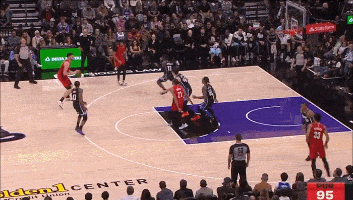 罚球线接到球 看到在侧翼的防守人横移过来 转手给到底角的阿夫迪亚