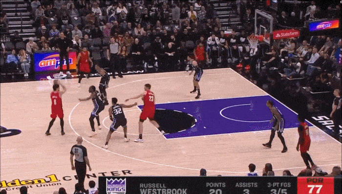 看到内线有防守人 发现雷诺在外线是大防小 果断传球(这球也许再成长几年之后就会自己攻了)
