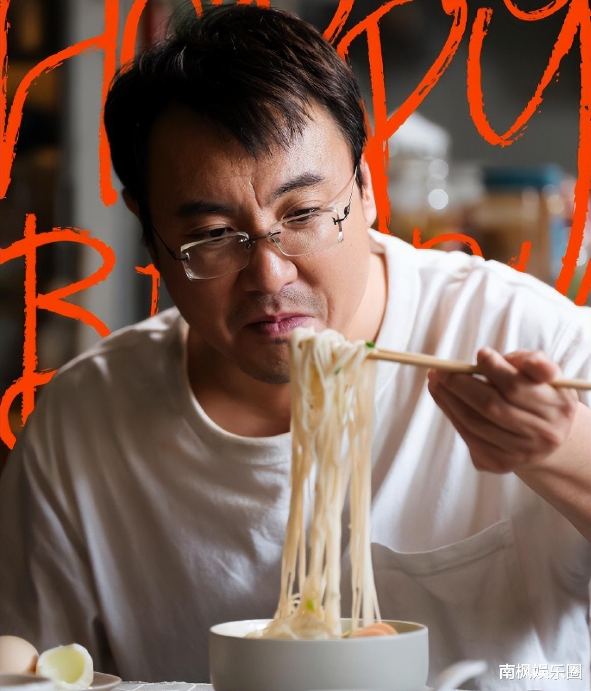 普通的白短袖、无框眼镜,一脸严肃地吃面。