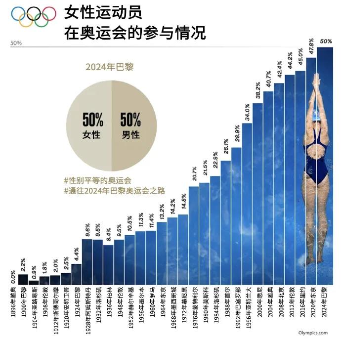 百年奥运,女性占比从0到50%,两个看似简单的数字,其实是性别平等路上100%的进步。