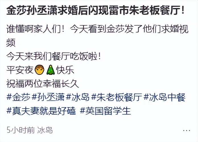 后来,还有网友偶遇金莎和孙丞潇在冰岛的中餐厅吃饭。