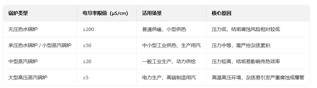 GB/T 1576-2018 明确,锅炉水电导率标准随锅炉类型、工作压力和温度变化,压力温度越高,限值越严格,具体如下: