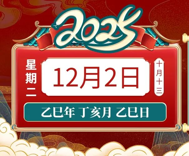 2025年12月2日,星期二,农历十月十三 (乙巳年丁亥月乙巳日),法定工作日。