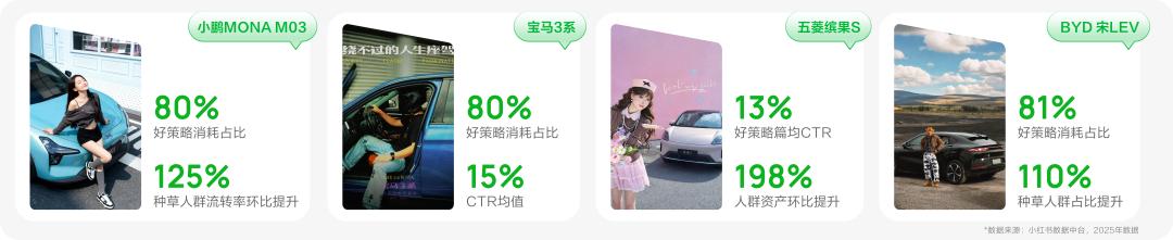 不少新车型都已验证了SPUx人群x内容的有效性,好的策略能从CTR与种草人群转化率上,给到车企直观的反馈,帮助车企在投放周期内有的放矢地更新迭代。小红书的种草AID小程序则更直观地呈现好策略,帮助车企把预算倾斜到好策略上。