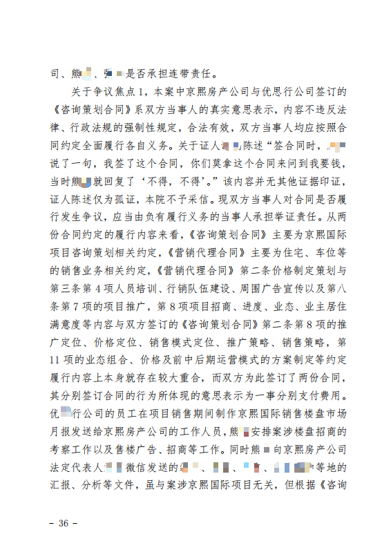 四川广安武胜县京*房产开发公司与熊*控制的成都同*恒房产营销策划公司和成都优*行房产营销策划公司就案涉“京熙国际”项目的销售签定了一份《房屋销售代理合同》和一份《咨询策划合同》,两销售公司系小规模纳税人,签两份合同系分摊销售额,《咨询策划合同》并未实施,仅用于分摊销售额,此情况在经营中较为常见,并无大碍。后熊*未完成销售违约撤场。