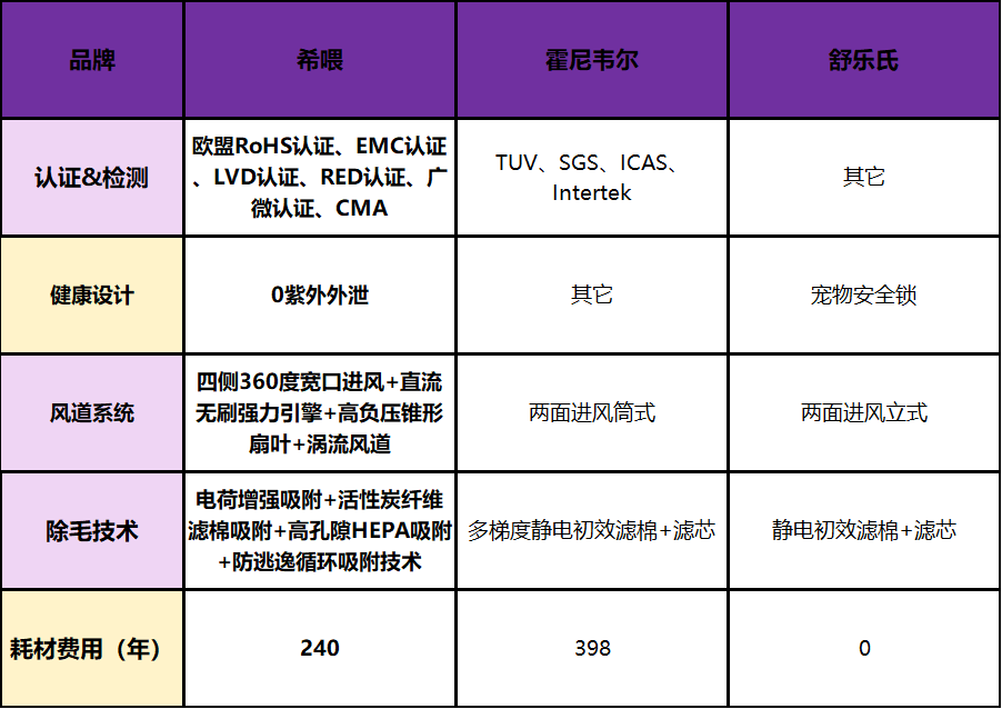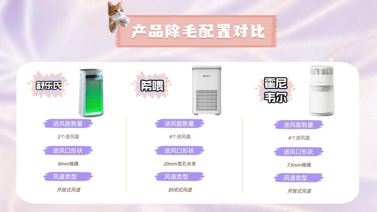 希喂在结构设计上明显围绕宠物浮毛治理优化,其余两款更偏通用型空气净化思路。