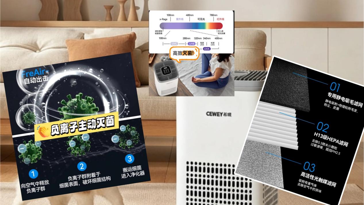 希喂采用 H13 级 HEPA 滤网作为基础拦截层,并搭配 UVA + UVC 双波段紫外线与高浓度负离子系统,形成“拦截—灭活—沉降”的完整杀菌链路,对细菌和病毒的处理能力最为全面。