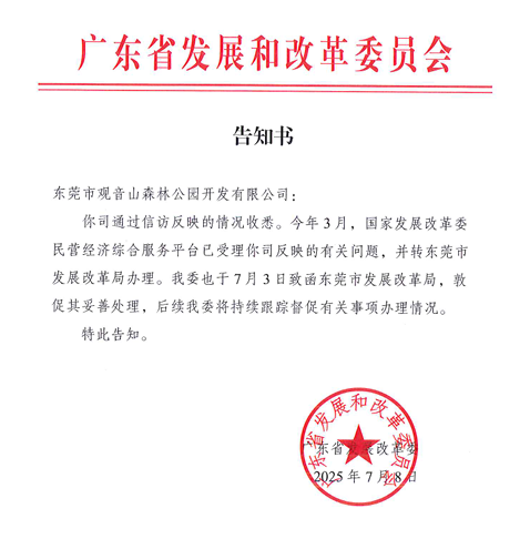 图为市林业局对林某辉毁林案的答复。两处合计500多平方米树林被毁坏开垦成菜地、果树地的事件,进一步凸显东莞市林业局的懒政与变相不作为。2019年4月,观音山公司工作人员巡查发现该毁林开荒行为后,立即向东莞市林业局书面举报并附上现场照片证据,后续又提交书面报案材料。但林业局2019年7月的答复却谎称“现场未发现砍伐树木情况”,并称已督促属地社区完成植树复绿。2020年11月,公司发现同一区域又新增150平方米左右林地被毁,再次书面报案,林业局2021年1月答复称系此前复绿树苗枯死,仅再次督促社区复绿。因不满林业局仅作书面答复、不依法调查处理的做法,观音山公司起诉至法院。诉讼中,面对确凿证据,林业局不得不承认“七星围”山头两处合计约400平方米林地被开垦的违法事实,却将查找违法行为人的法定职责推给石新社区,而社区仅在现场张贴告示要求行为人主动联系。更荒唐的是,林业局竟将未查处的责任归咎于观音山公司未能提供明确的违法行为人,全然无视查找行为人本就是其法定职责。在多次举报投诉无果的情况下,为维护自身合法权益及公园的生态安全,观音山公司于2025年3月正式向国家发改委民营经济综合服务平台提交信访材料,详细反映了上述千余亩树林被毁及东莞市林业局涉嫌玩忽职守、失职渎职的问题。为确保信访事项得到有效处理,观音山公司在信访材料中附上了完整的证据链,包括历次举报的书面材料、现场照片、视频、东莞市林业局的答复文件、林地权属证明、相关法律法规依据等,共计100余页。信访材料中明确提出了诉求:恳请相关部门对上述毁林事件进行全面深入调查,依法查处相关违法违规行为并对市林业局的失职渎职行为进行追责问责2025年7月8日,观音山公司收到了广东省发展和改革委员会(以下简称“广东省发改委”)出具的《告知书》,该《告知书》明确表示,已收悉观音山公司反映的情况,已将该信访事项转至东莞市发展和改革局(以下简称“东莞发改委”)办理,并致函敦促东莞发改委妥善处理。收到《告知书》后,观音山公司深感欣慰,认为此事终于得到了上级部门的重视,于是在2025年9月3日专门向国家发改委、广东省发改委分别寄送了回函,对其高度重视民营企权益、积极推动信访事项办理的行为表示衷心感谢,并表示将积极配合东莞发改委的调查处理工作,耐心等待处理结果。