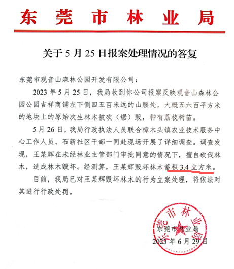 图为违建别墅。村民王某辉违法砍伐树木事件,则直接暴露了东莞市林业局的包庇袒护行为。2023年5月21日,观音山公司工作人员巡查时发现,公园吉祥商铺左下侧四五百米远的山腰处,五六百平地块上的原始次生林木被毁坏,现场种植了荔枝树苗。经粗略统计,被砍伐的直径从指头粗到碗口粗的树木达百十来棵。公司报案后,有关部门多日未到现场查看,遂再次向东莞市林业局书面报案,并提交了现场拍摄的照片、视频作为证据。但东莞市林业局在2023年6月29日的复函中却谎称,已赴现场详细调查,认定王某辉未经审批擅自砍伐林木,测算毁林蓄积3.4立方米,并称已立案处理将依法处罚。观音山公司通过提起诉讼才发现,林业局所谓的“详细调查”纯属谎言,其甚至未给王某辉做过调查笔录,所谓“3.4立方米”的毁林蓄积也仅为推算结果,与现场实际情况相差巨大。更令人愤慨的是,林业局早在2023年6月19日就已对王某辉作出行政处罚,却在6月29日的复函中刻意隐瞒该事实,且至今未向观音山公司出具《行政处罚决定书》,也未向法院提供,其掩盖包庇王某辉违法行为的意图十分明显。