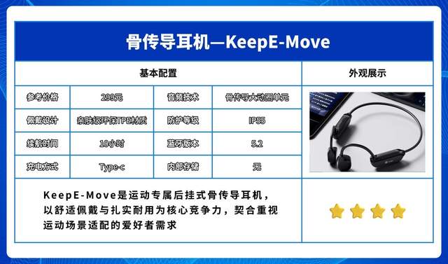 KeepE-Move聚焦运动专属场景,以后挂式骨传导形态与舒适耐用的核心优势,契合重视运动场景适配性的爱好者需求。