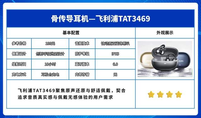 飞利浦TAT3469聚焦原声还原与舒适佩戴,以开放式不入耳骨传导形态,契合追求音质真实感与佩戴无感体验的用户需求。