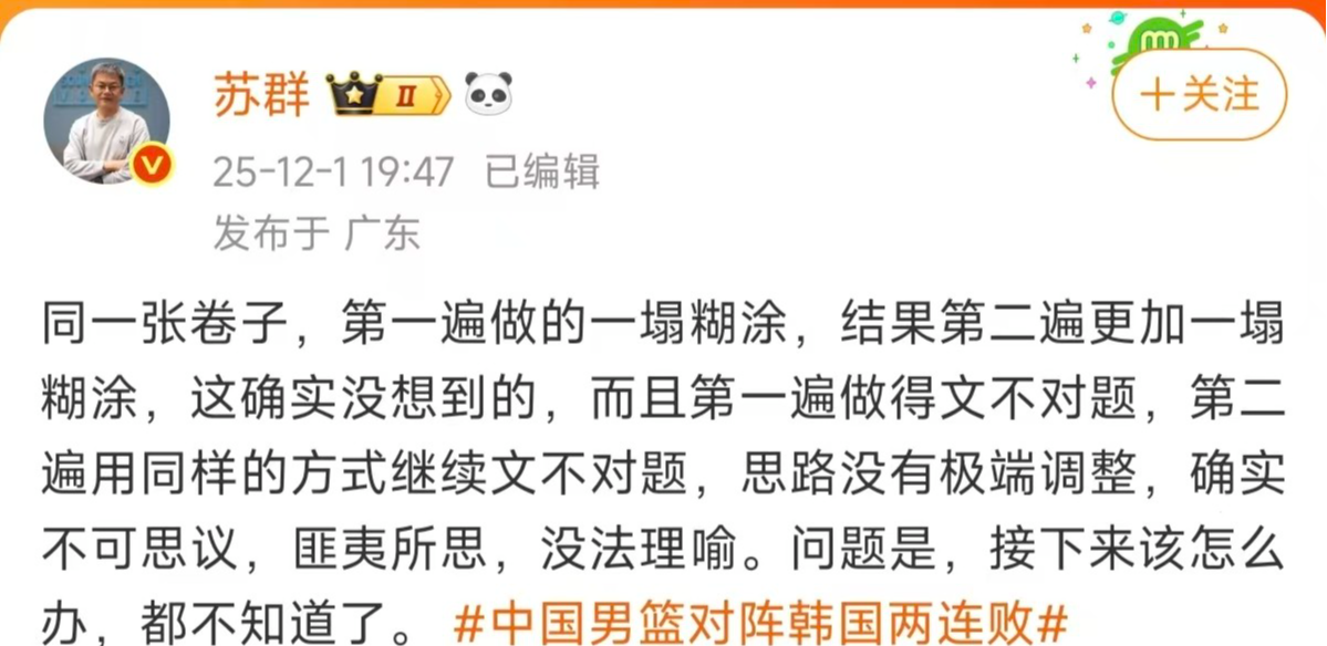 再看看篮球评论员苏群说:“同一张卷子,第一遍做的一塌糊涂,结果第二遍更加一塌糊涂,这确实没想到的,而且第一遍做得文不对题,第二遍用同样的方式继续文不对题,思路没有极端调整,确实不可思议,匪夷所思,没法理喻。问题是,接下来该怎么办,都不知道了。”确实中国男篮已经不是第一次输韩国了,明知道自己不足的地方,还是用同一样的人,基本一致的战术打法,人家都已经摸透你了。