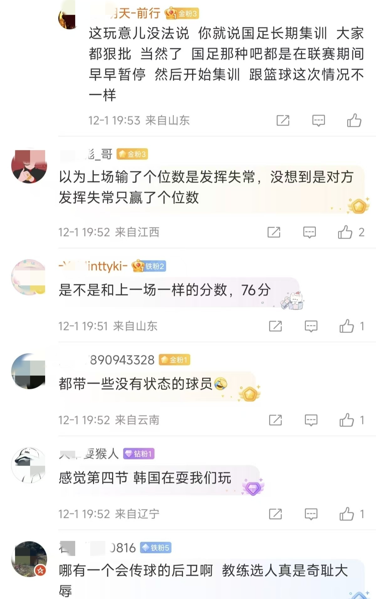 再看看球迷说的:“感觉第四节韩国在耍我们玩一样。”另外一个球迷说:“哪有一个会传球的后卫啊教练选人真是奇耻大辱。”