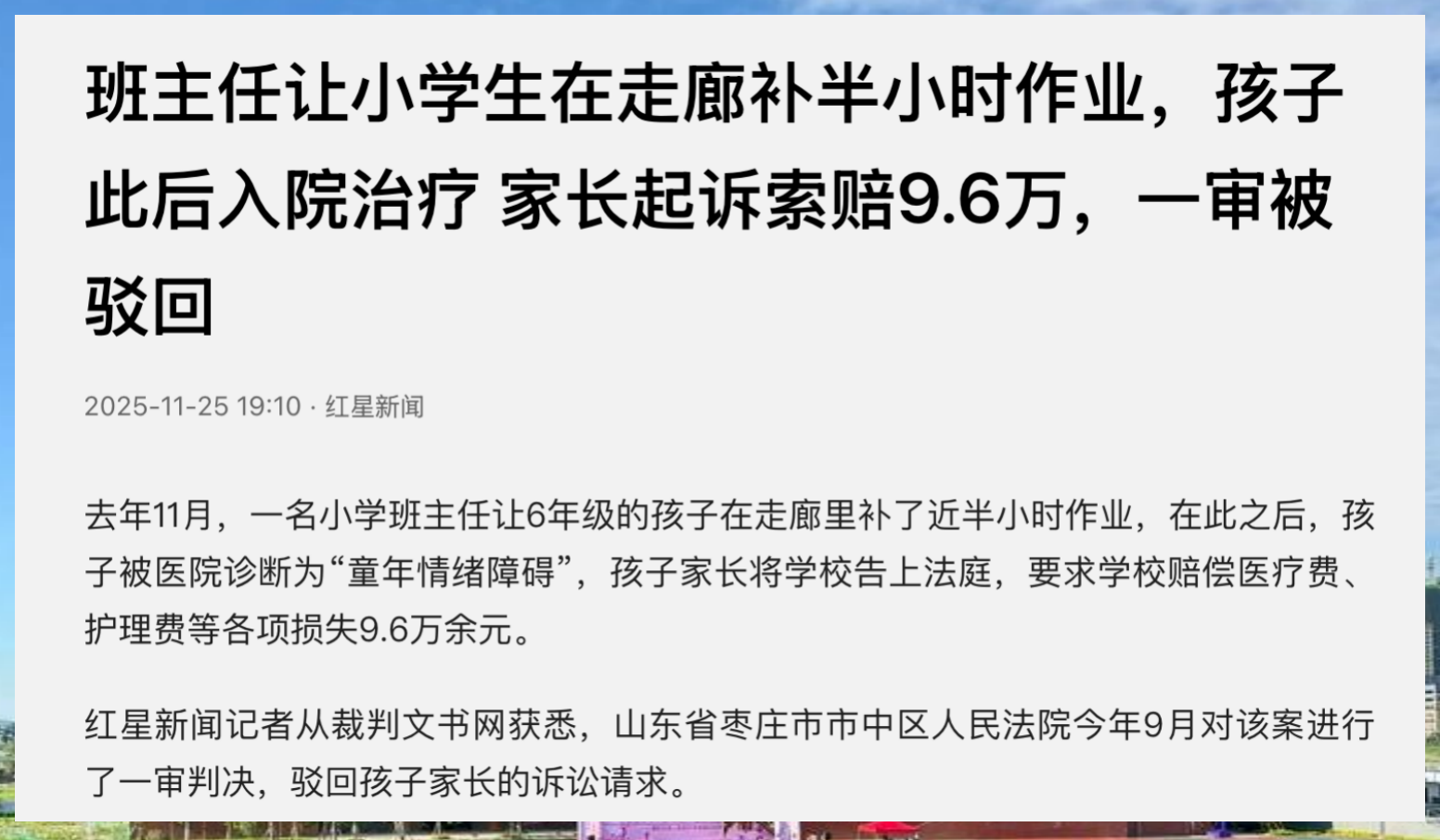 红星新闻11月25日报道,山东们孩子被老师罚在走廊补了半小时作业,此后孩子入院,最终确诊“童年情绪障碍”,家长将学校告上法庭,索赔九万六,该案迎来了法院的一审判决:驳回诉求,学校无责。