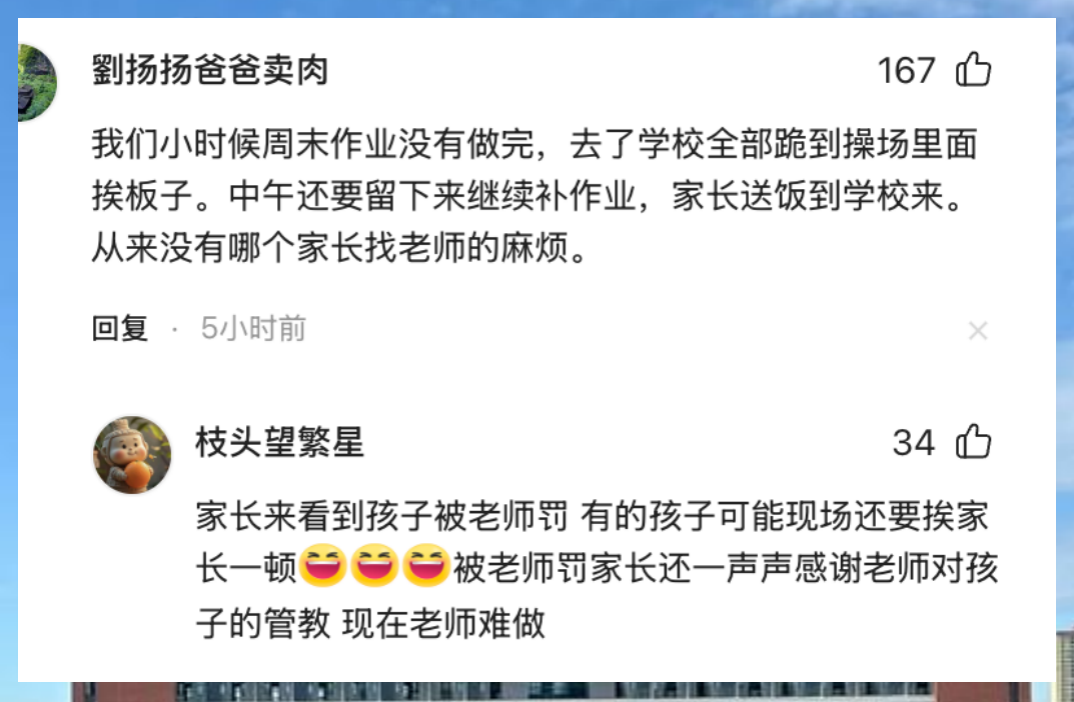 翻看着评论区,仿佛步入了一个时空交错的隧道。一边是70后、80后们集体的记忆:“我们小时候周末作业没做完,全部跪到操场挨板子,家长送饭到学校,从来没人找老师麻烦。”“八零后小时候,谁还没在走廊写过作业?”