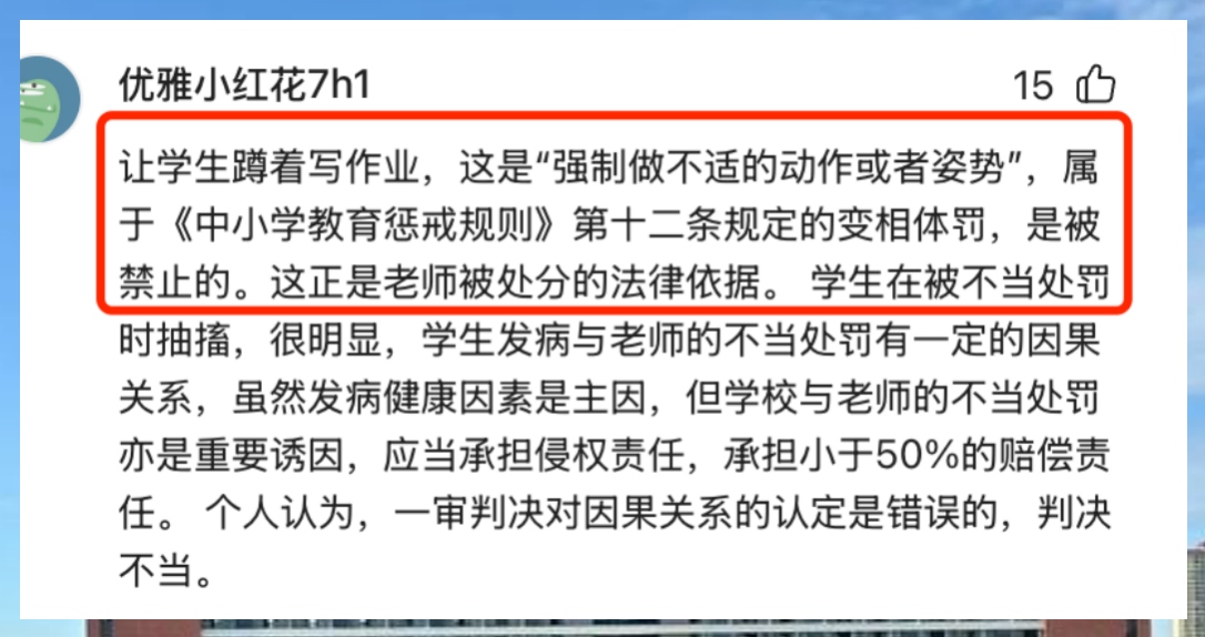 正如另一位网友引用《中小学教育惩戒规则》所说,这正是涉事老师被处分的依据。教育的起点是“人”,任何以贬低人格、践踏自尊为代价的管理,即使短期内奏效,长远看也可能是失败的。那个在走廊里身体开始抽搐的孩子,他的病因或许复杂,但那个时刻的他,无疑正承受着巨大的压力。有网友清醒地认识到:“大概率不会是老师罚孩子抄写半小时作业,就导致了孩子患上情绪障碍的。但老师罚抄,可能成了压垮孩子的最后一根稻草。”