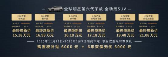 全新荣放在外观、智能座舱、动力、智驾辅助、安全配置等方面全面升级,全系商品力提升达到1.5万元水平,增配价更低,诚意满满。不仅如此,为回馈广大用户的支持,11月21日起到2026年1月9日期间,确定为“限时尊享下定期”。期间预定用户,将享有高达1.8万元的现金直给,以及购置税补贴6000元,价值6000元售后服务权益的双重限时大礼包。