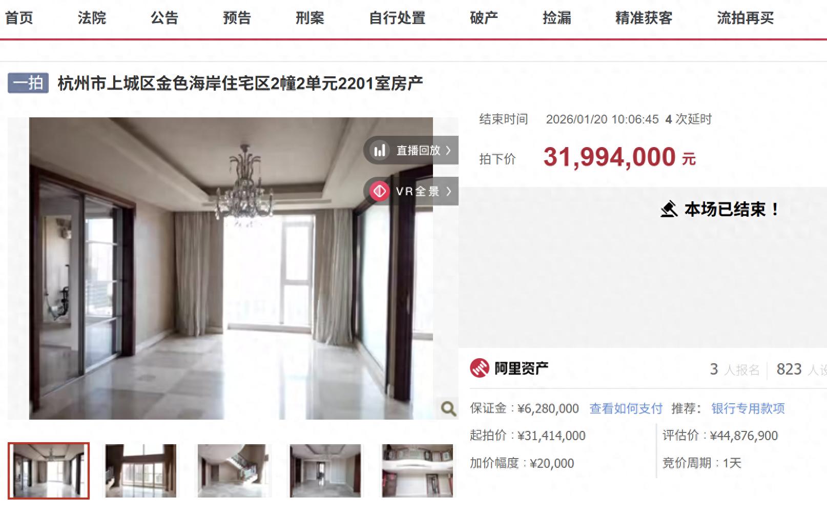 这场拍卖引发了市场广泛关注,累计吸引2.2万余次围观,823人设置提醒,最终历经5轮出价,以3199.4万元敲定成交,成交单价约8.49万元/平方米,为评估价的7.1折。