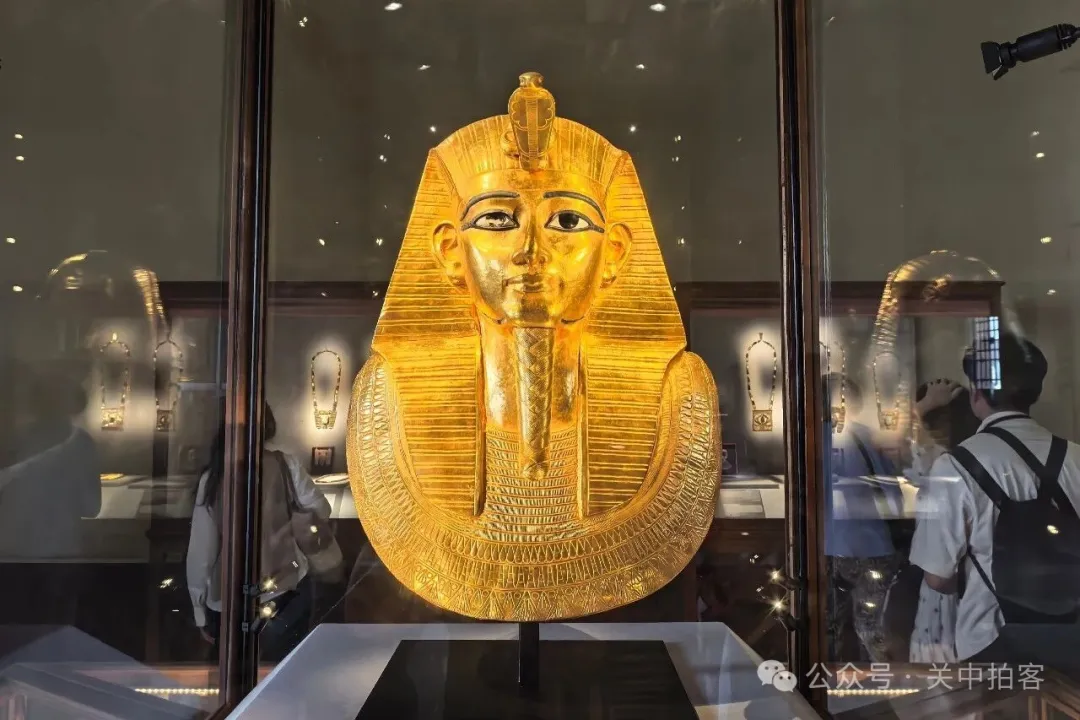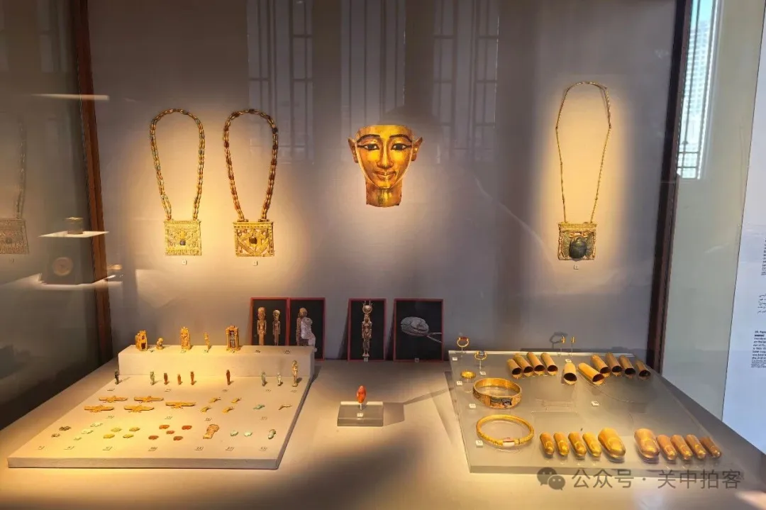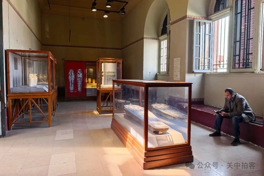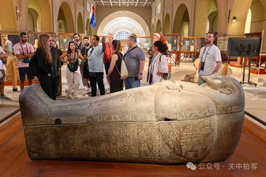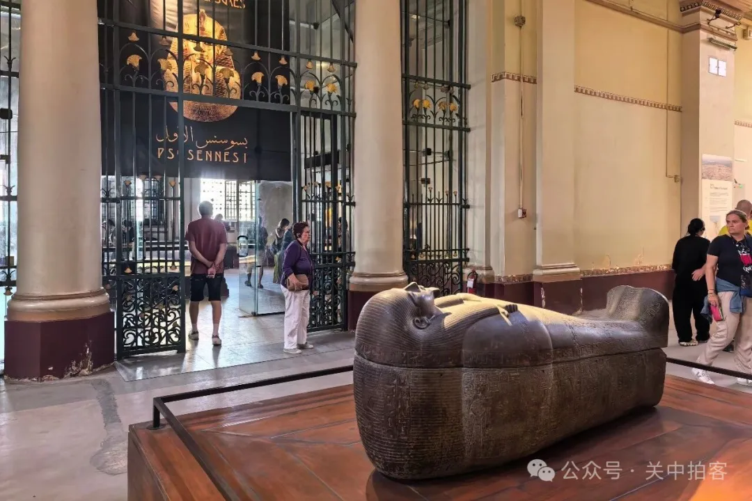 2025年11月21日中午,我来到埃及博物馆二层北侧的第3和第4展厅,参观了“塔尼斯的宝藏”文物展,虽然展厅面积不大,但是吸引众多游客。在第3展厅的入口处,上方悬挂着黄金面具的海报,前方摆放着巨大的人形石棺,充满神秘,引人入胜。