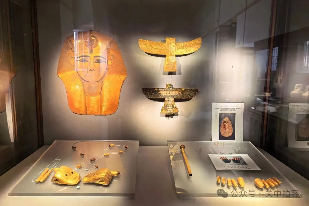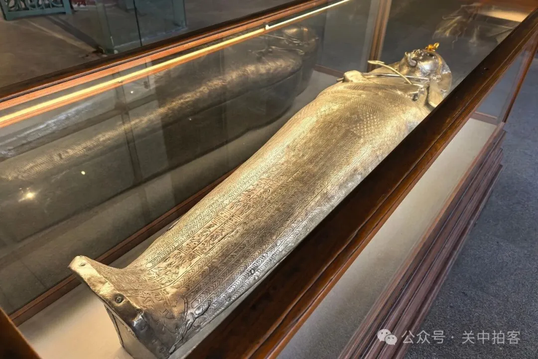 这里原本陈列着舍尚克二世银棺,跟其他人形棺不同,外观呈鹰头人身状,象征守护神荷鲁斯。当时,埃及盛产黄金,白银非常稀缺,银棺的价值远远高于金棺。可惜,在舍尚克二世银棺的展柜内,只能看到图片,原物没有展出。