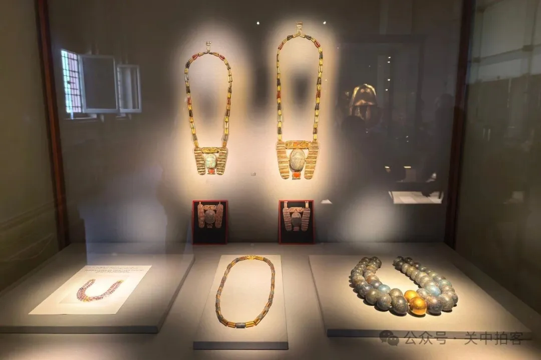 在展厅最显眼的位置,摆放着一件黄金面具,曾经覆盖于银棺内普苏森尼斯一世的木乃伊头部。法老被描绘成最理想化的面庞,黑白相间的玻璃装饰于眼睛和眉毛,额头有一条眼镜蛇,下颌有一个假胡须。在脖子上,佩戴十二条串珠和三条装饰着水滴、植物、几何纹饰的金带。