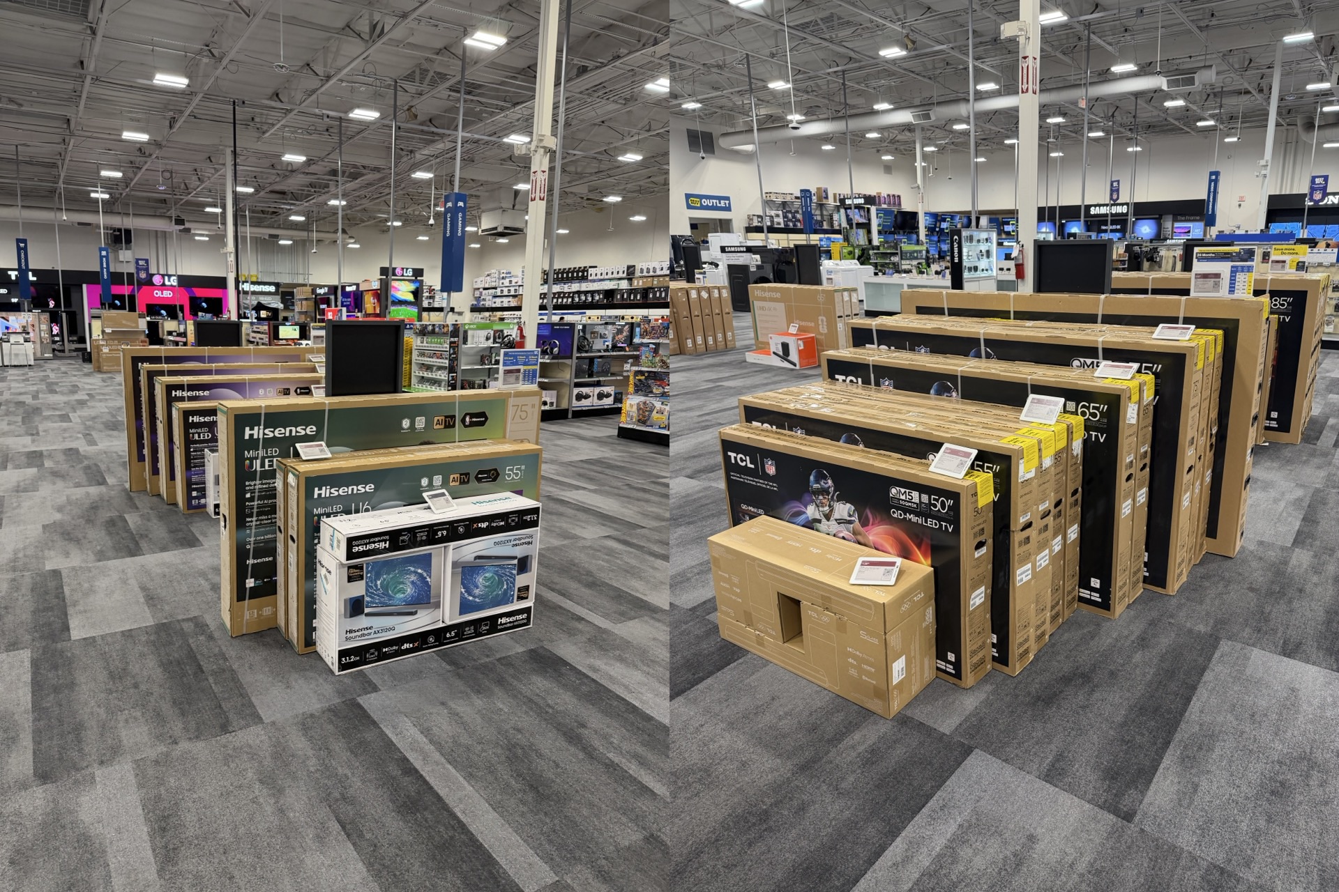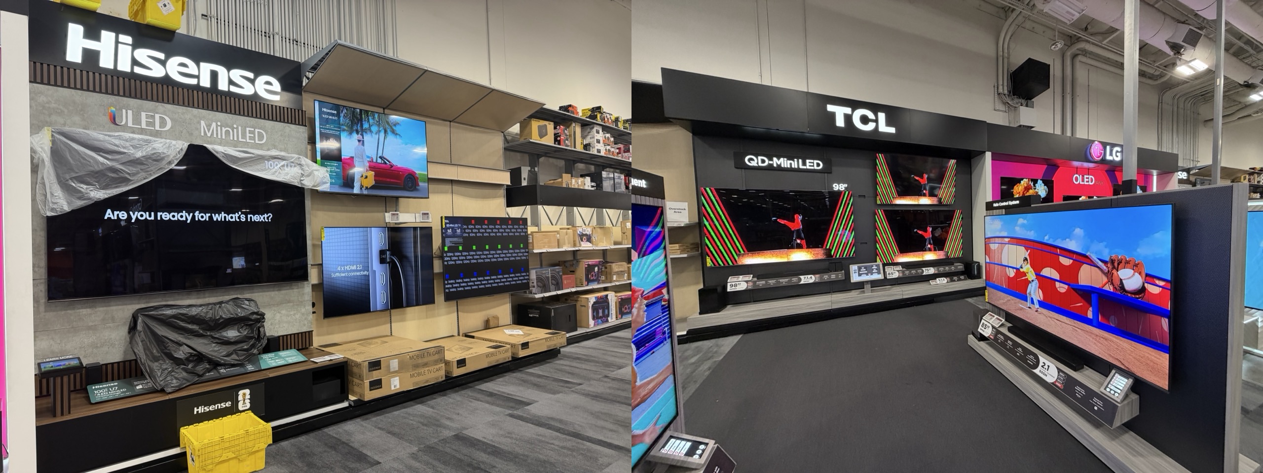 在拉斯维加斯百思买的电视专区,和中部的陈设专区,海信、TCL品牌及其电视产品,连刷存在感,而且均在黄金位置。