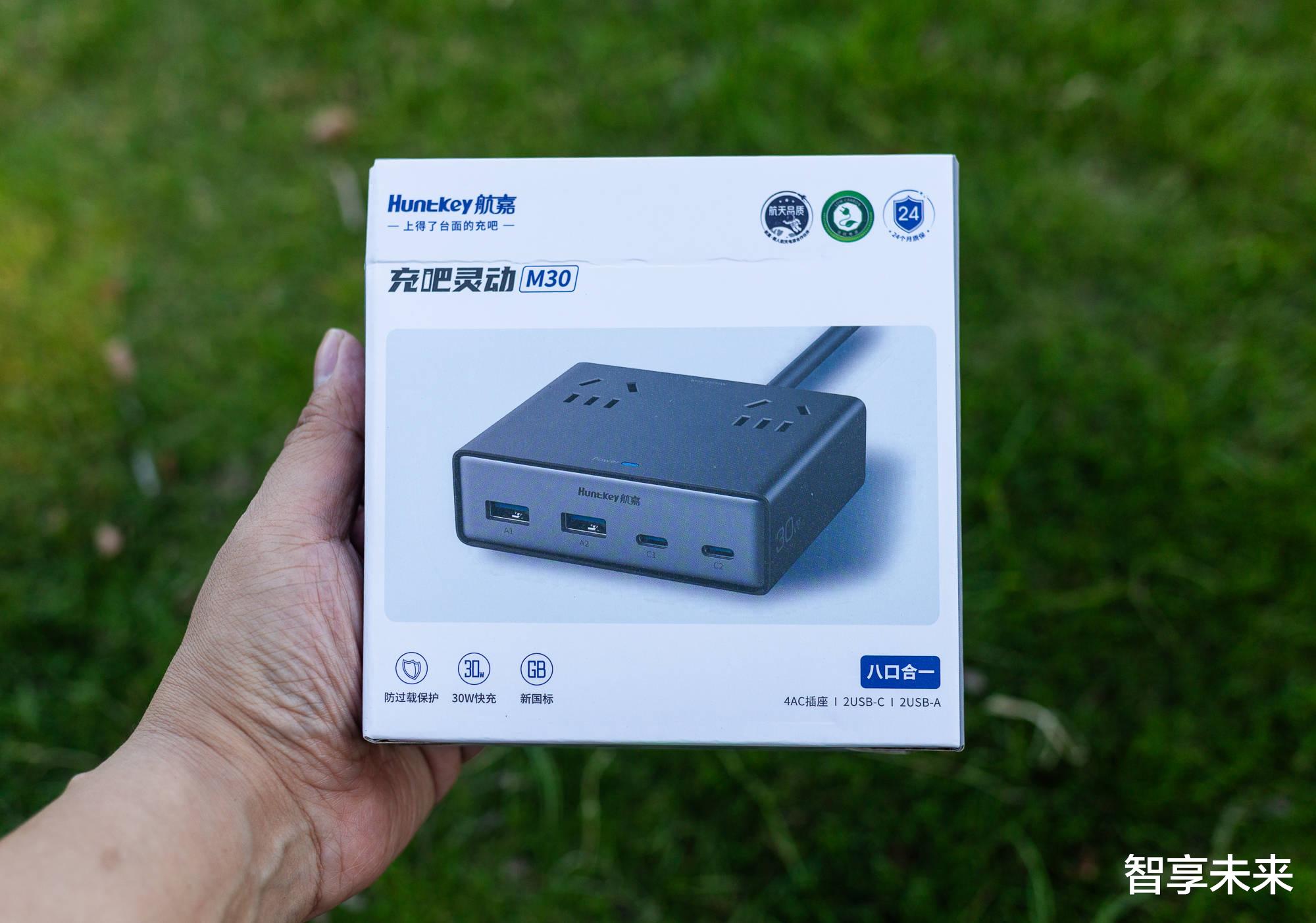 我熟悉航嘉,是从台式机的机箱和电源开始的。经过三十年的发展,航嘉不仅有机箱电源等电脑主机产品,还有与之相关的工业电源产品、终端消费产品,其中包括智慧家电和智能电工,安全快充,扩展坞和移动电源等产品。这次我所要体验的充吧灵动M30就是属于智能电工产品中的一种。