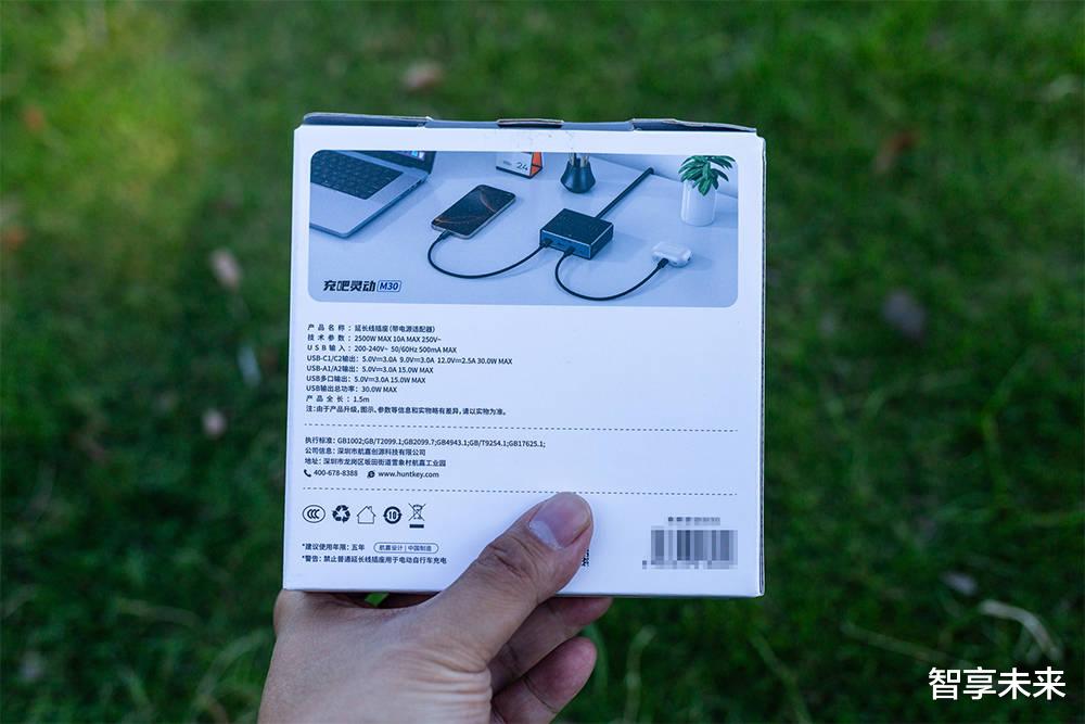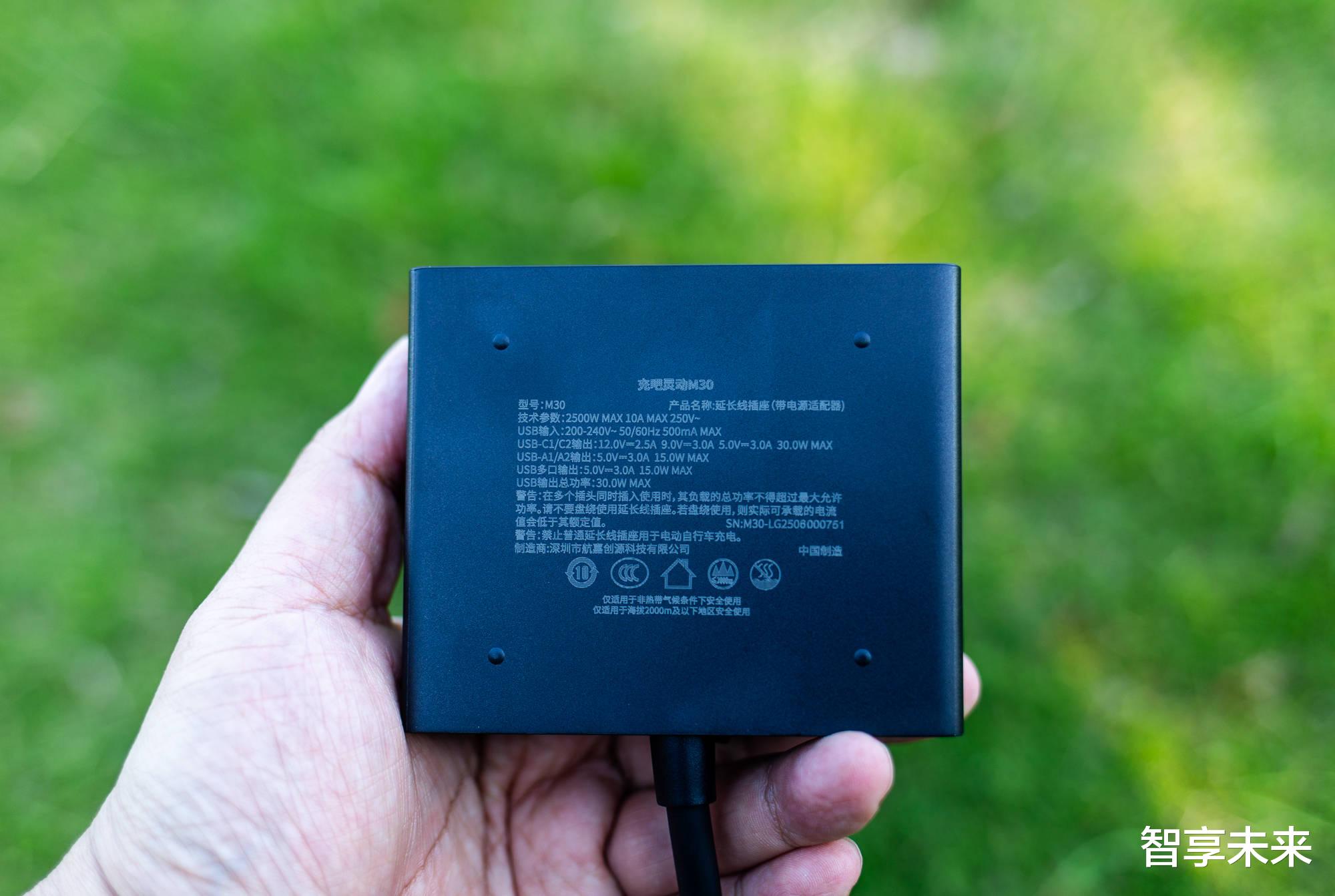 航嘉充吧灵动M30采用750℃的阻燃外壳,安全更有保障。在航嘉充吧灵动M30的底部,是产品标签, 可以看到详细的技术参数,及多设备同时输出的功率。其中特别注明了,禁止用于电动自行车充电,虽然这款产品功能强大,但是还是不要违规使用哦!