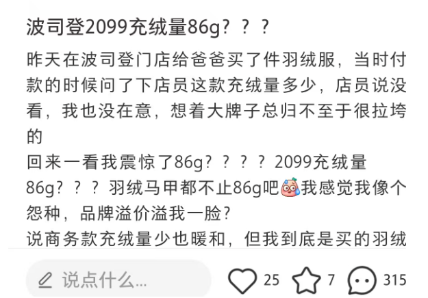 针对消费者对品牌溢价的质疑,波司登官方客服于1月9日回应称,品牌所有羽绒服的充绒量均符合国家标准,产品定价并非单纯取决于充绒量,而是综合考量原料品质、工艺设计、功能配置等多重因素。
