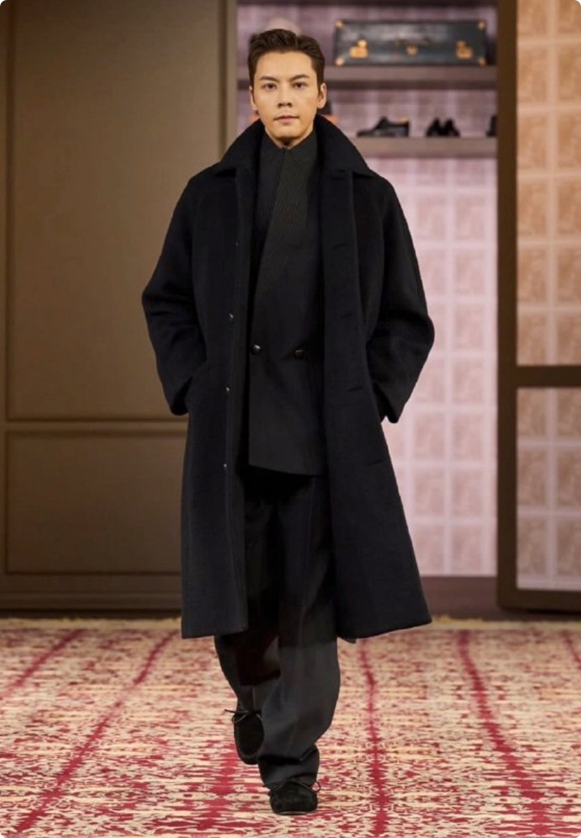 一身剪裁利落的黑色长款大衣加身,长度刚好到小腿的版型,完美勾勒出他一米八二的优越身材比例,行走间衣摆带风,自带大片滤镜。内搭简约的深色套装,也把贵公子的氛围感拉满。