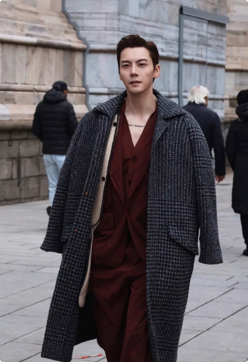 酒红色的面料自带高级光泽感,贴身的剪裁完美展现了他修长的双腿和挺拔的身姿,行走间贵气逼人,活脱脱一个从豪门剧里走出来的贵公子。