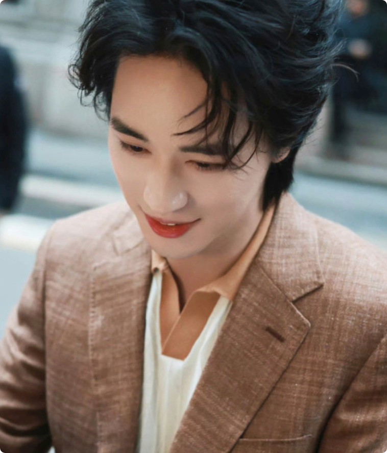 单看造型,确实挑不出什么毛病,驼色衬得他肤色白皙,西装的修身版型也勾勒出了不错的身材线条。