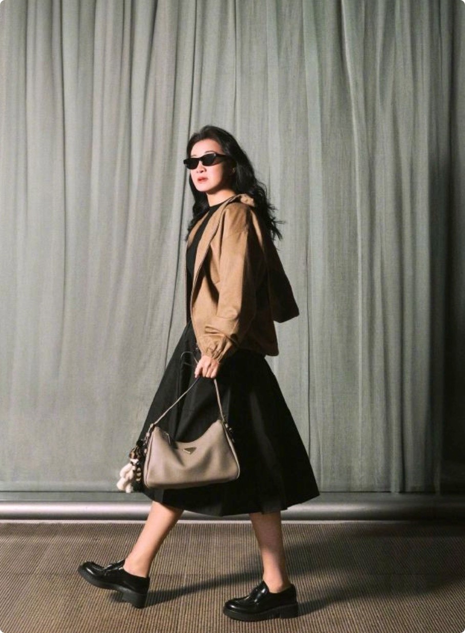 作为Prada打破常规签下的代言人,她这次的造型虽然争议不小,棕色皮革宽松外套搭配浅蓝色短裙,脚踩黑色拉带小高跟,看似臃肿的穿搭,却被她穿出了独一份的松弛感。