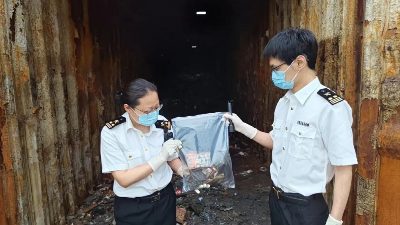 某日,宁波海关所属梅山海关在对进境空箱监管时,发现空箱称重设备提示超重。后经开箱人工查验,海关关员在入境空箱内查获旧塑料、旧纸等物品,且有明显焚烧痕迹。