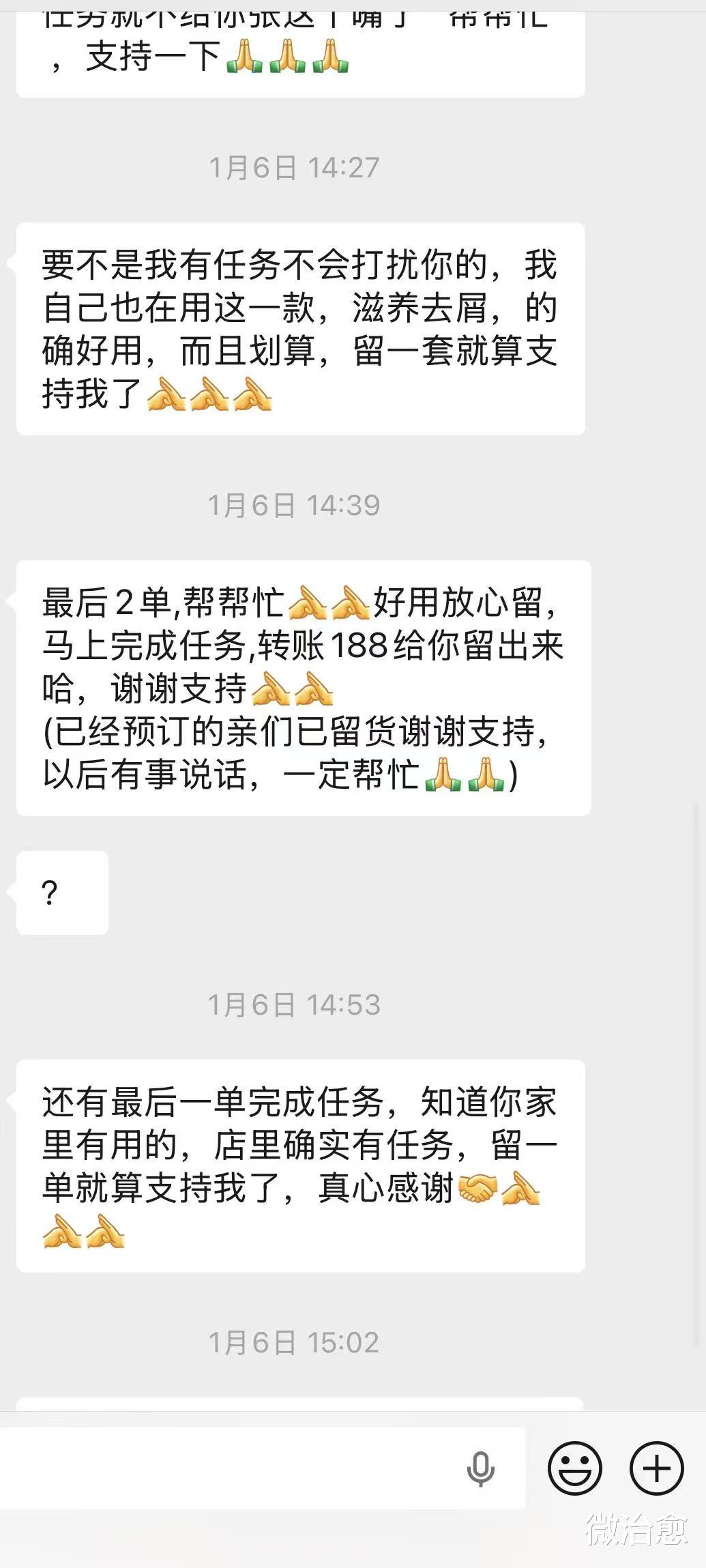 还有一次,也是熟人开的美甲美容店,有一次突然收到信息说,她那有个什么任务,让我支持一下,就是买她们的洗发水,我就回了不需要,因为家里洗发水也囤了很多。