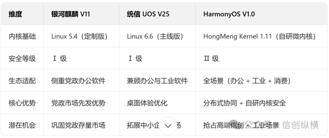 从行业影响看,HarmonyOS的入局将倒逼麒麟、统信加速技术升级:例如统信已在V25版本中将Linux内核更新至6.6,银河麒麟也计划推出基于微内核的新版本,国产OS的“技术内卷”将推动整体生态向更高安全、更高性能演进。