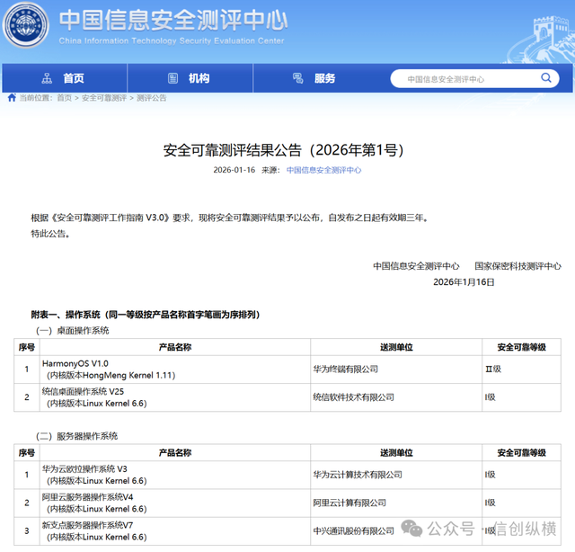 2026年1月16日,中国信息安全测评中心、国家保密科技测评中心联合发布的《安全可靠测评结果公告(2026年第1号)》,标志着国产操作系统发展进入全新阶段——华为HarmonyOS V1.0(内核版本HongMeng Kernel 1.11)首次入围“国测名单”,并以Ⅱ级安全可靠等级刷新国产桌面操作系统的最高标准。这一突破不仅打破了信创桌面领域长期由麒麟、统信主导的“双寡头”格局,更借助自研内核与政策东风,为“十五五”期间信创终端、智能终端的“鸿蒙时代”奠定基础。