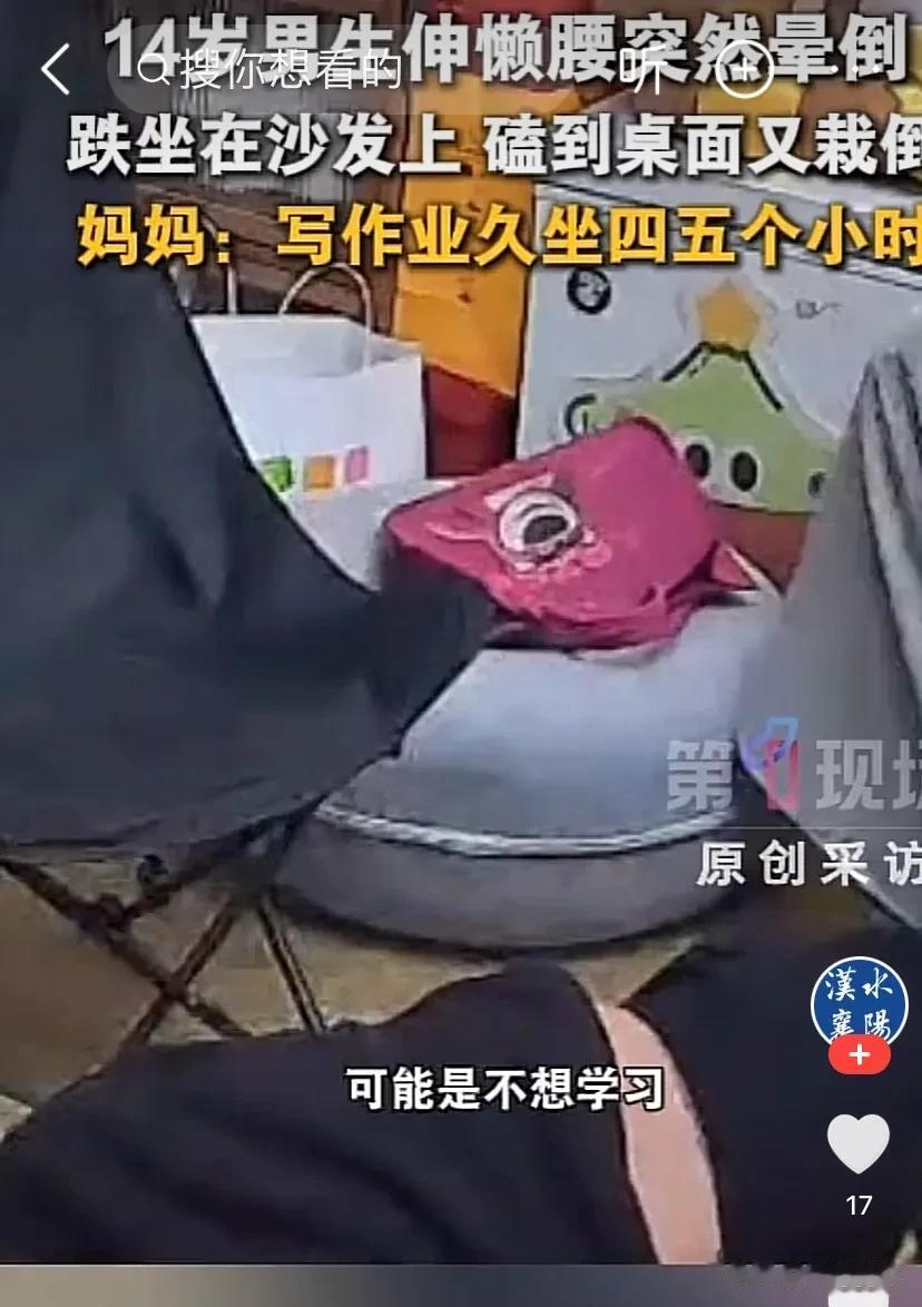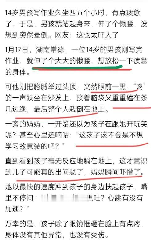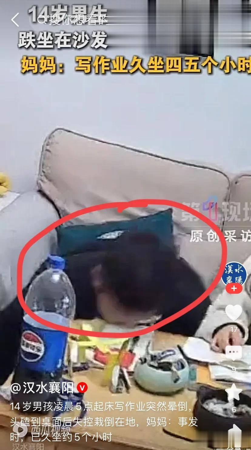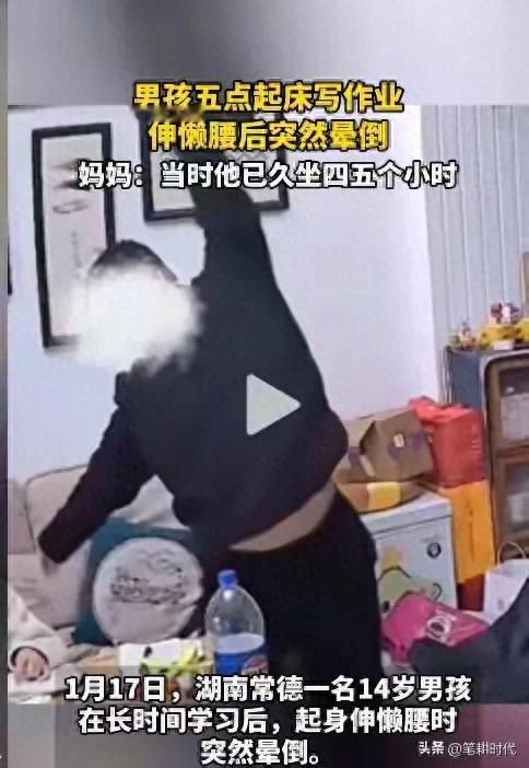 1月17日,湖南常德,一14岁男孩凌晨五点就起床赶作业,连续久坐五个小时晕倒。