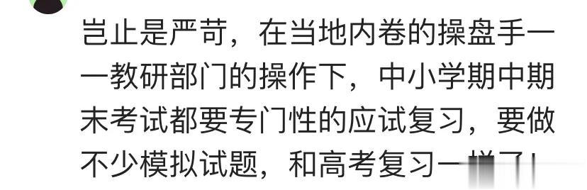 有人表态,岂止是严苛,中小学期末考试都要专门性地应试复习,要做不少模拟试题,几乎和高考复习一样了!