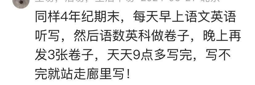 有的家长说,四年级,语数英每天学校一套卷子,回家一套卷子,周末老师会发很多的资料,让家长自愿打印复习,堪比高考。