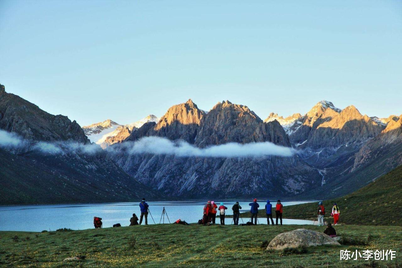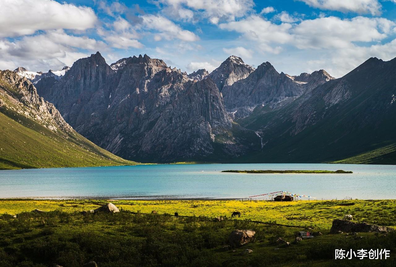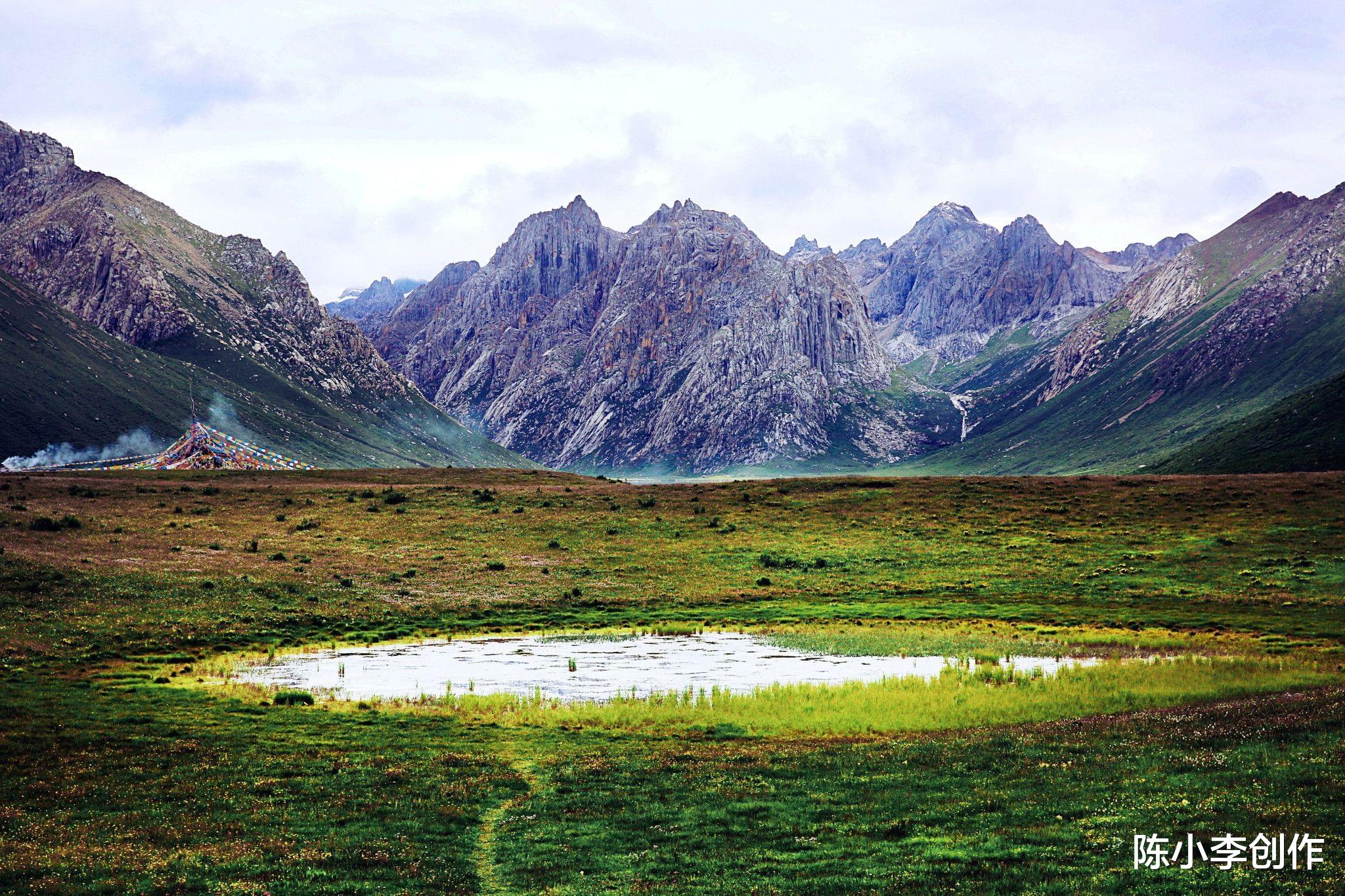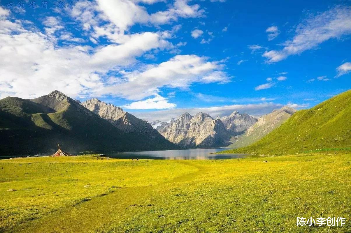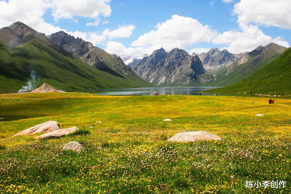 五彩斑斓的野花肆意绽放,碧蓝的湖水倒映着雪峰,山间雾霭缭绕,如同世外桃源。云在空中凝固,经幡迎风起舞,和着草原上的群鸟鸣叫,让人忍不住赞叹大自然的绝妙。