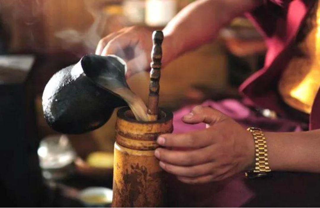 就在这信仰的中心,酥油茶静静流淌在藏民的日常里。它不只是饮品,更是文化血脉的载体。百度百科记载:“酥油茶是藏族待客、礼仪、祭祀不可或缺的用品,极具民族特色和文化内涵。”在高原严寒中,它御寒暖身;在信仰仪式里,它敬献神佛;在人际交往中,它传递情谊。藏族谚语说:“茶是血,茶是肉,茶是命。”一碗酥油茶里,融着牦牛的坚韧、茶叶的远行、盐湖的守望,更融着藏汉民族千年交融的深情。