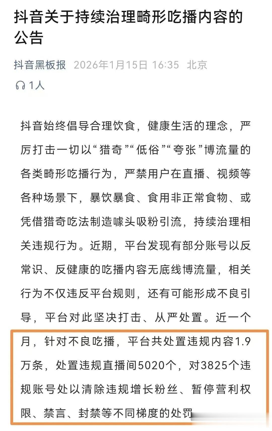 这种畸形吃播行为,极易形成不良导向并破坏平台生态。平台已经忍无可忍,抖音率先出手,肃清此类乱象。