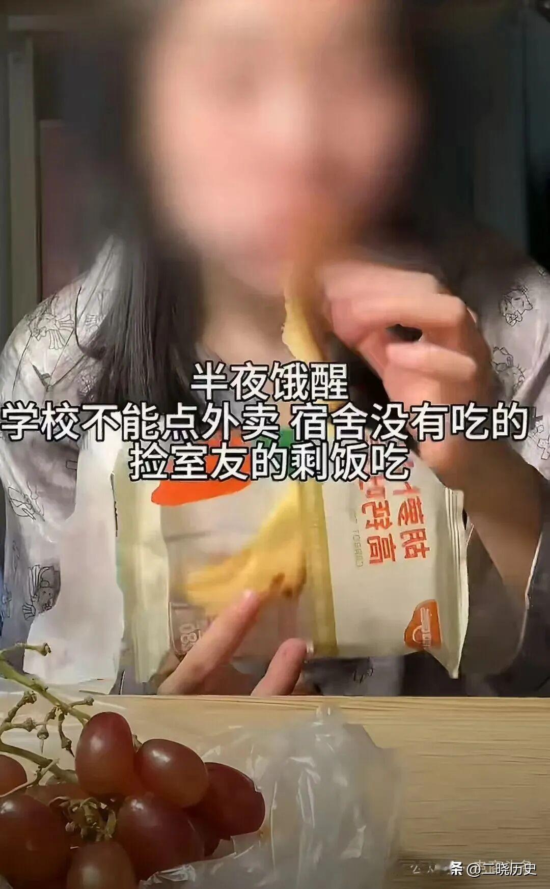 其中一个视频里,“快快超快乐”先翻找了装满垃圾的宿舍垃圾桶,捡出一袋开封剩下的面包边角料和番茄酱;随后在堆放有外卖包装袋和垃圾的宿舍走廊过道,捡走了几块鸡腿、鸡叉骨和小半串葡萄。最后,博主向镜头展示捡到的剩饭,并开始吃了起来。