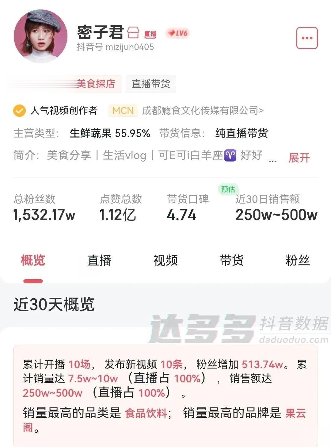 据达多多数据,密子君近30天的销售额在250万到500万之间,销量最高的品类是食品饮料。