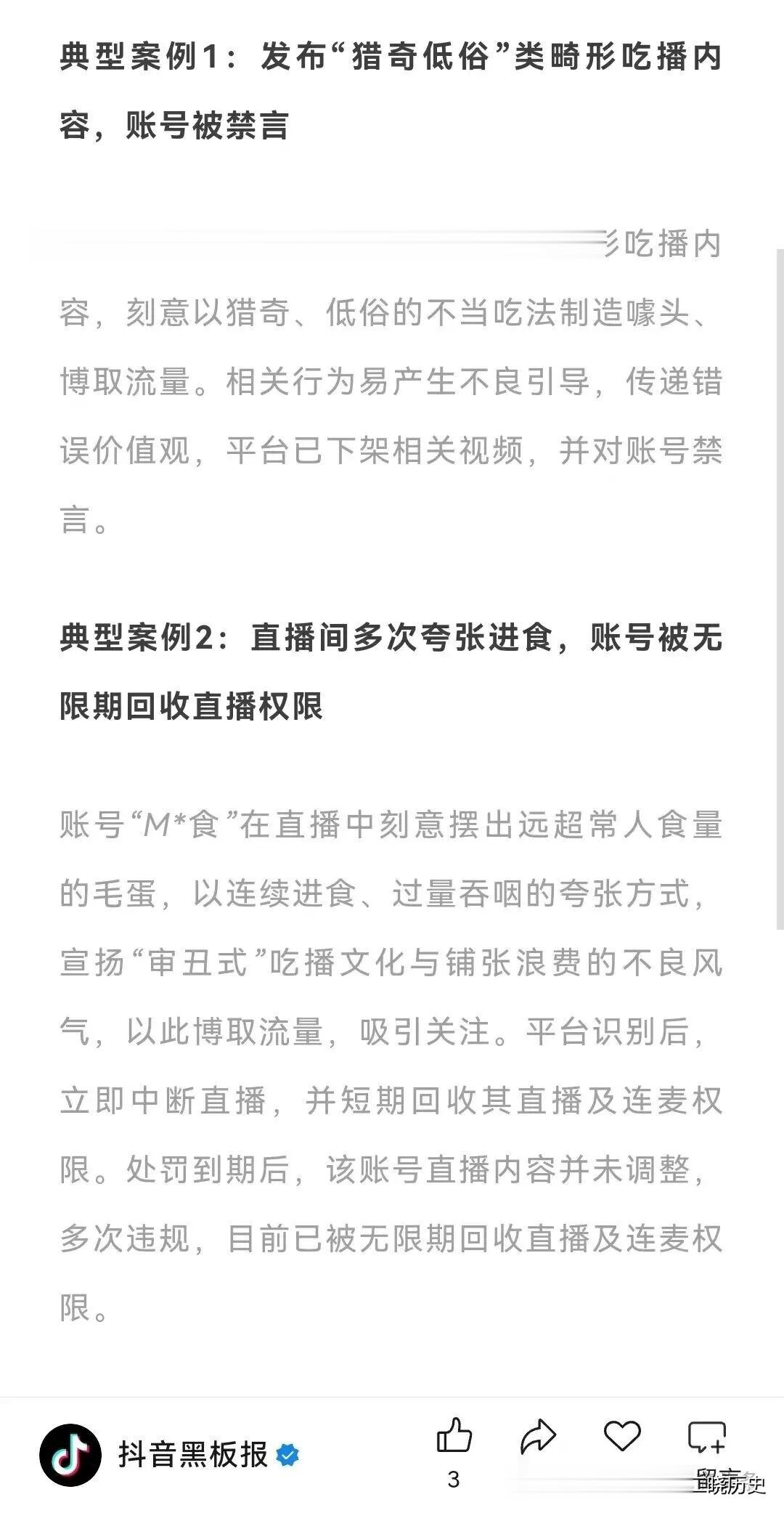 据抖音黑板报,近期,平台发现有部分账号以反常识、反健康的吃播内容无底线博流量,相关行为不仅违反平台规则,还有可能形成不良引导,平台对此坚决打击、从严处置。