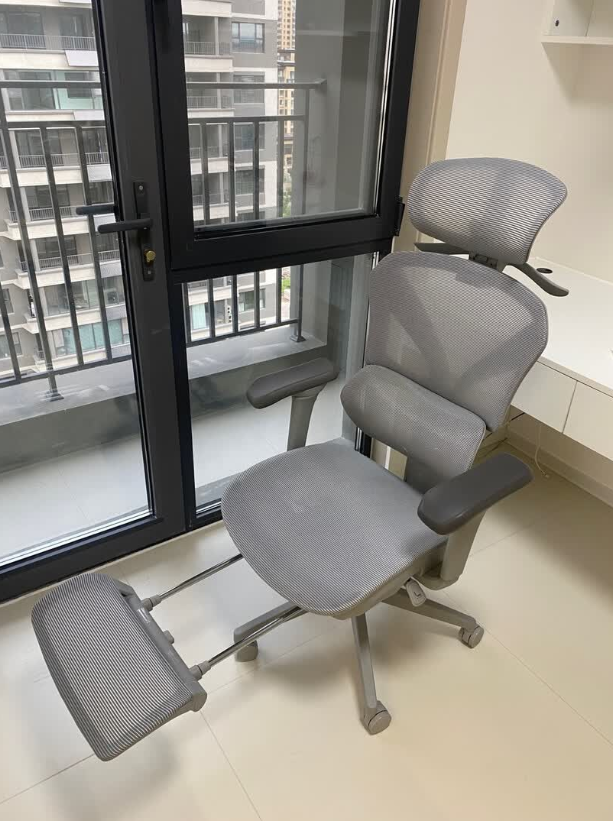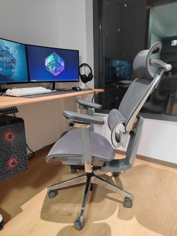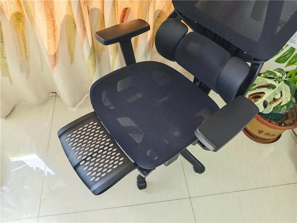 椅背贴合度挺好,背部压力分布均匀,没有明显硌点。头枕尺寸大,后仰或午休时脖子不悬空。座垫前缘是流水式设计,对大腿友好,久坐不太容易麻。不过网布偏软,大体重用户坐久支撑感会弱一点。