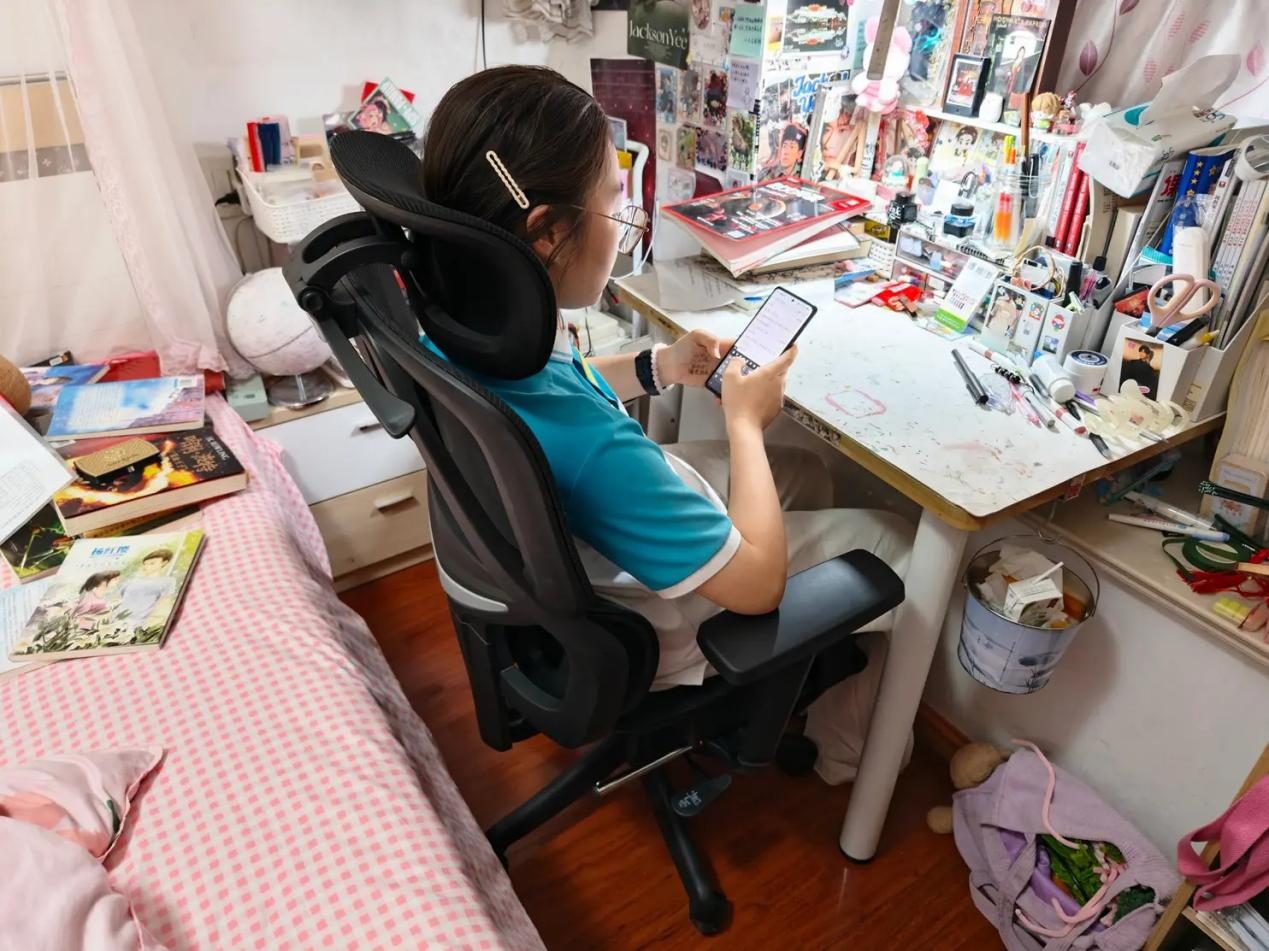 其次是调节好不好用,不是功能越多越好,而是常用的调节要顺手。头枕能调高低和角度,低头办公、后仰休息都能撑住脖子;扶手能调到和桌面齐平,打字时肩膀不会悬着。