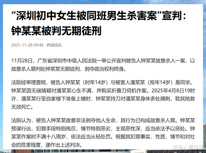 媒体报道,11月28日,“深圳初中女生被同班男生杀害案”宣判:钟某某被判无期徒刑。