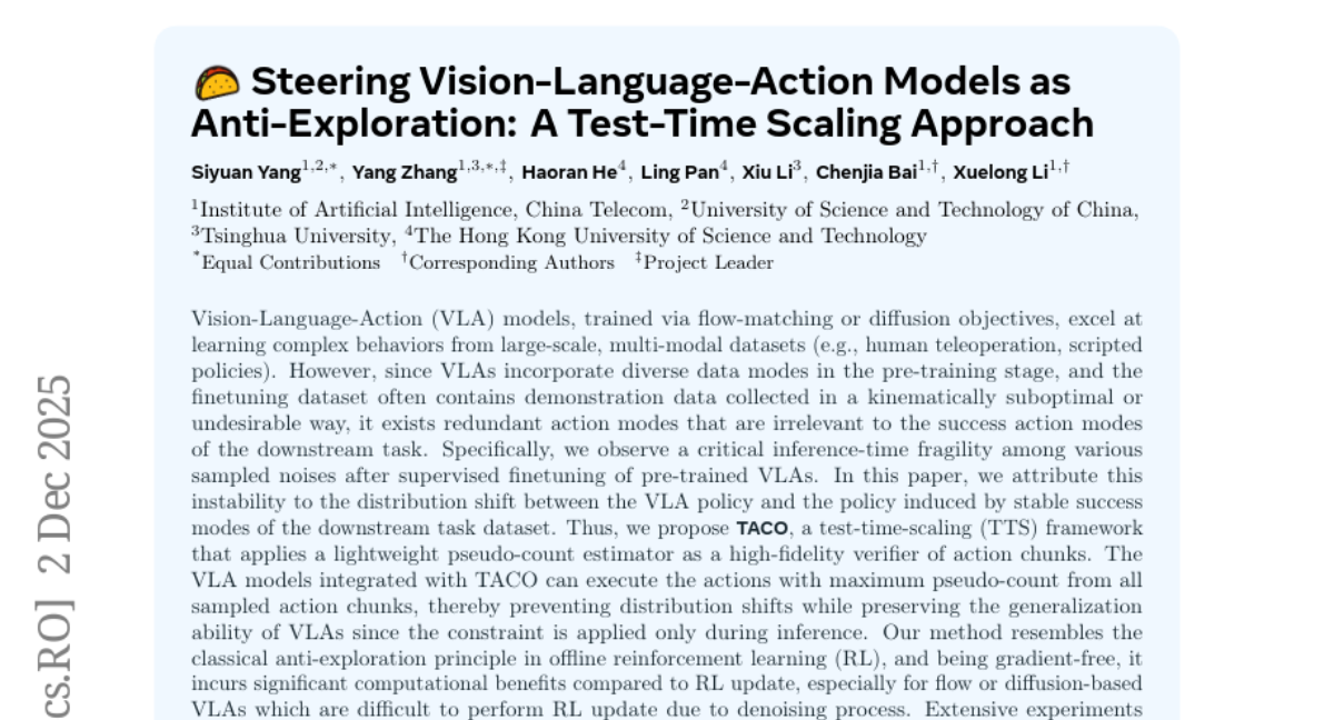 研究团队提出了一个名为"TACO"的创新解决方案,这个名字代表"Test-time Anti-exploration via pseudo-COunts",翻译过来就是"通过伪计数在测试时进行反探索"。听起来很技术化,但其核心思想其实就像给机器人安装了一个"味觉系统",让它能够在行动前"品尝"一下自己即将做出的动作,选择最"美味"(最可靠)的那一个。